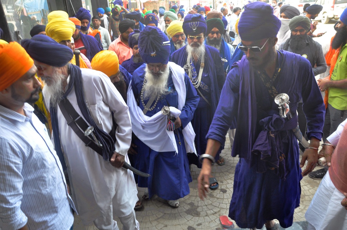 Nihang is an order of Sikh warriors, characterised by blue robes, antiquated arms such as swords and spears, and decorated turbans surmounted by steel quoits.