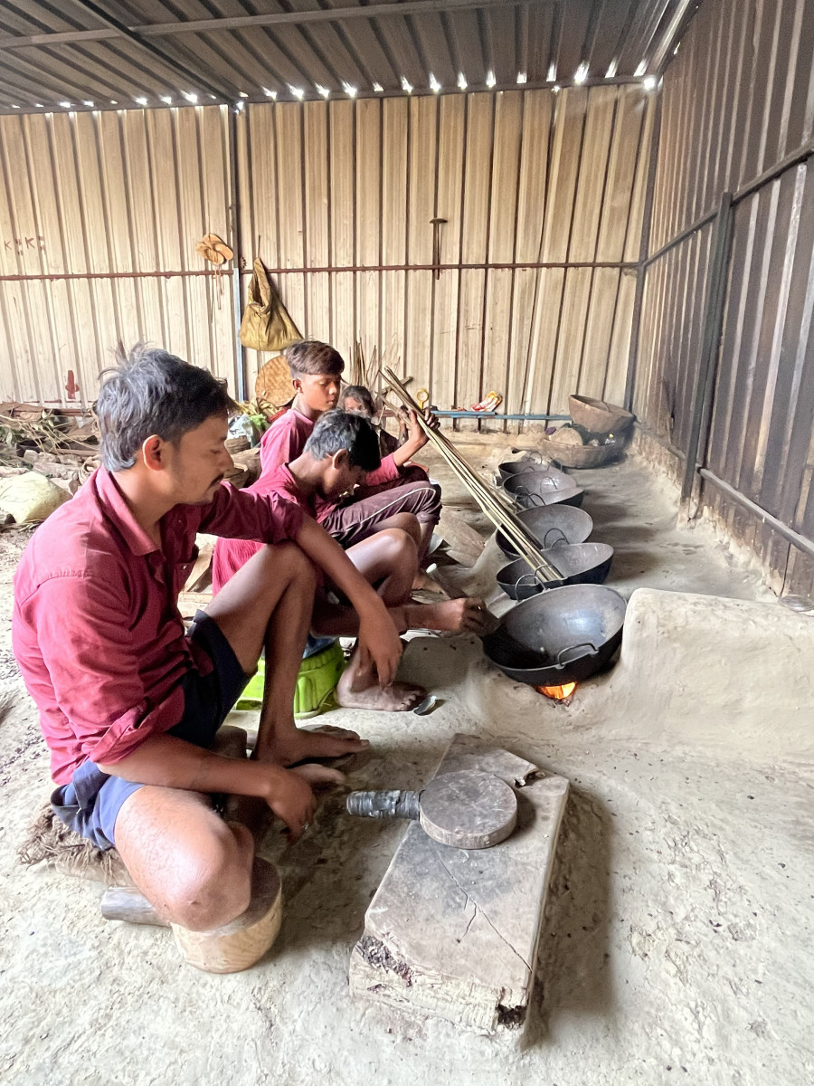 Manoj Saini, a twenty-something fox nut grower, demonstrates the precision required in roasting and popping the seeds after they’ve been harvested and sun-dried. First, a group of children continuously stir the harvested seeds on iron pans atop charcoal-fuelled clay stoves. When a faint crackling sound emerges, Manoj lifts them out onto a hard surface, where a mallet is used to strike them. The kernels jump around like projectiles before dropping to the floor – doubling in size with each blow.