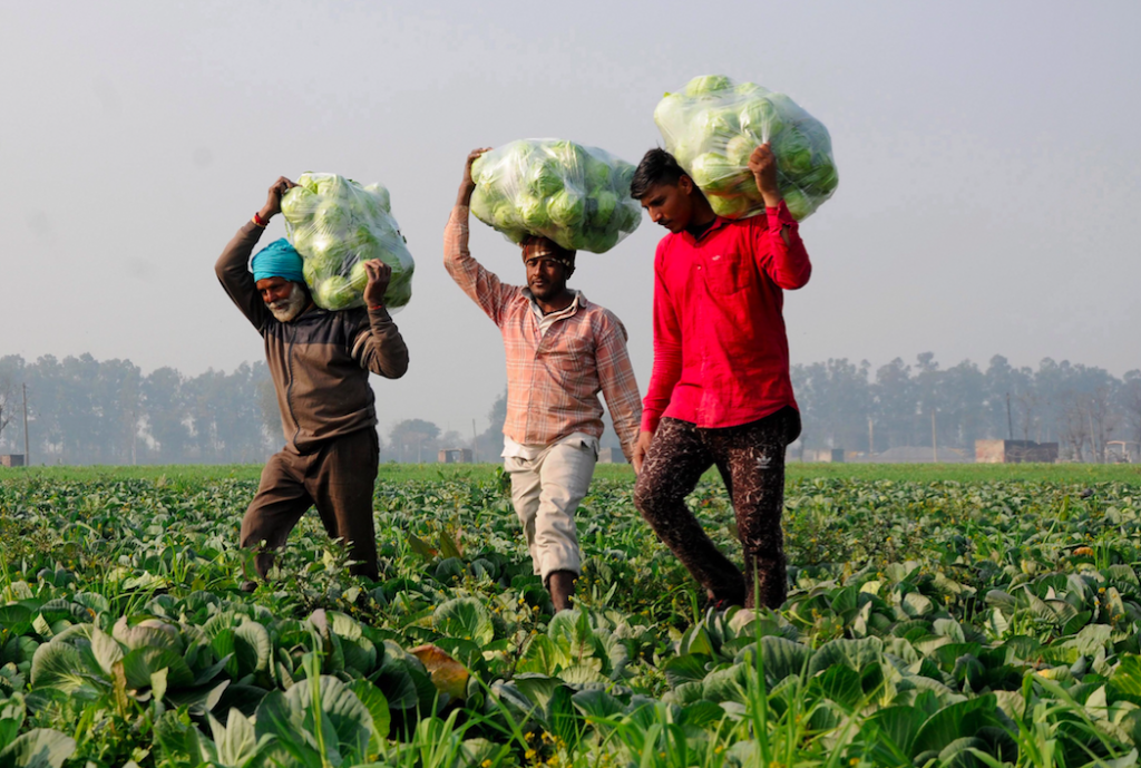 Farmers carry cabbage from their field on the outskirts of Amritsar, Saturday, February 1, 2020. Photo: PTI