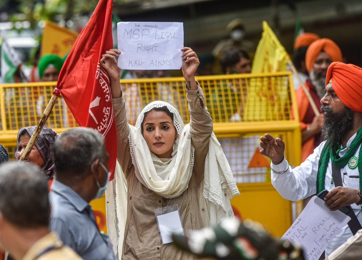Actor-model Sonia Mann with farmers during their Kisan Sansad at Jantar Mantar, in New Delhi, Thursday, July 22, 2021. Photo: PTI/Ravi Choudhary