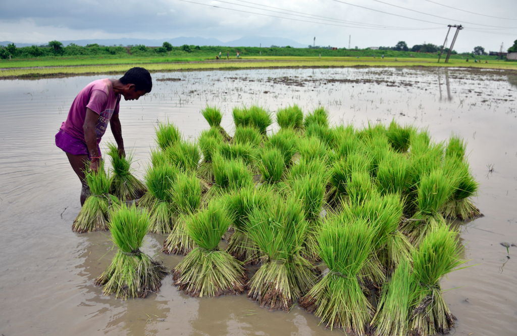 A farmer gathers saplings to be planted at a paddy field in a village in Nagaon district, in Assam, July 3, 2018. Picture taken July 3, 2018. Photo: Reuters/Anuwar Hazarika/Files