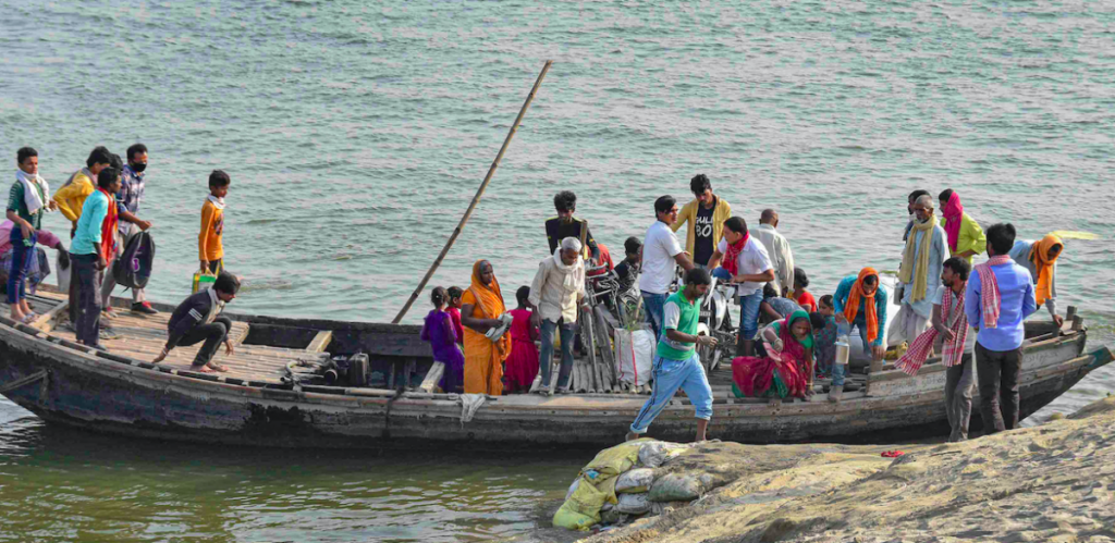 Locals commute in a crowded boat, violating curfew norms, during the nationwide lockdown to curb the spread of coronavirus, in Patna, Monday, April 13, 2020. Photo: PTI