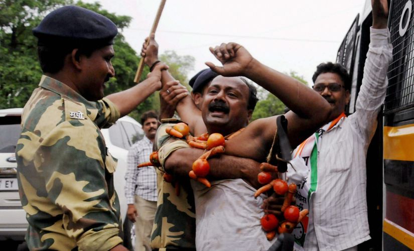 Farmers throwing vegetables on a road during a protest as part of the Maharashtra bandh. Credit: PTI