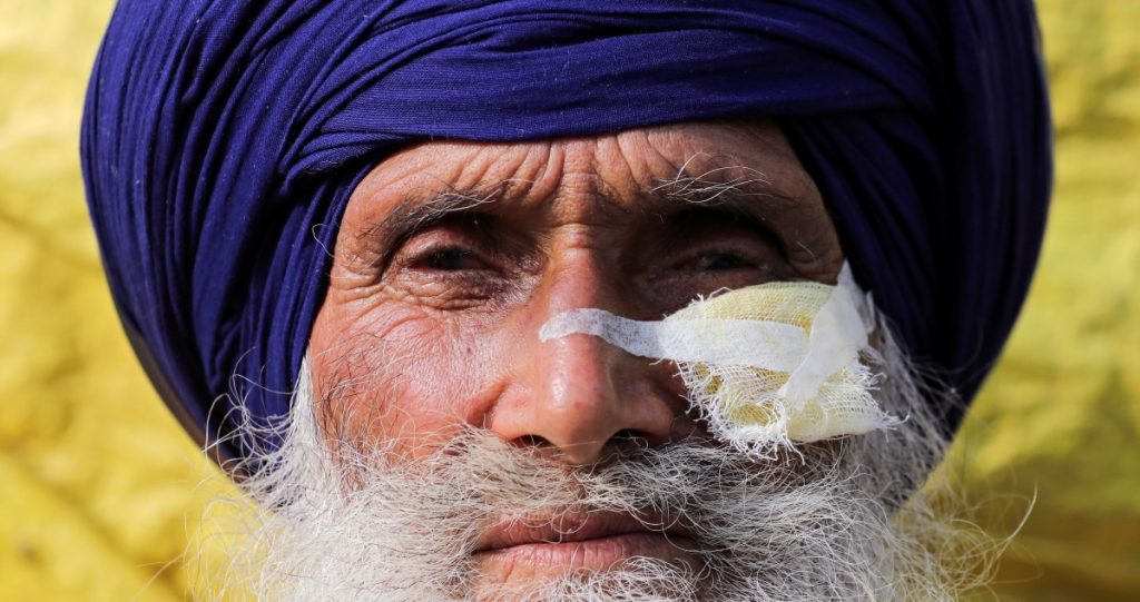 Santokh Singh, 70, a farmer who was hurt by a tear gas shell and received stitches, poses for a picture at the site of a protest against the newly passed farm bills, at Singhu border near Delhi, India December 2, 2020. Photo: Reuters/Anushree Fadnavis