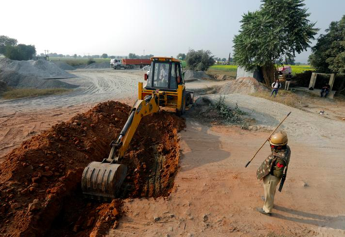 An excavator digs a ditch next to a national highway to stop the farmers, who are protesting against the newly passed farm bills, to cross a state border in Rewari district in the northern state of Haryana, near New Delhi, India, December 12, 2020. Photo: Reuters/Adnan Abidi