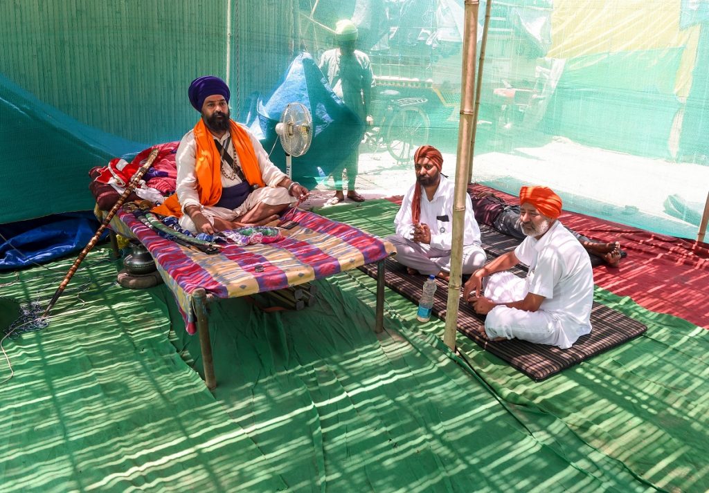 Farmers in a makeshift tent during their protest against the farm laws at Singhu border in New Delhi, May 26, 2021. Photo: PTI/Shahbaz Khan