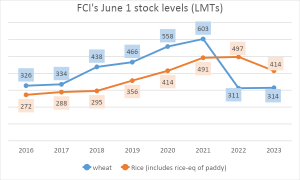 The central pool stock position for rice and wheat for the last 8 years is presented below. As of June 1 2023, it had about 41.4 MT of rice (including paddy equivalent) and about 31.4 MT of wheat. The stock position of wheat is below the 2016 levels.