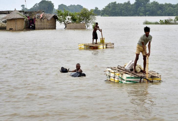 Flood-affected villagers use temporary rafts as they navigate through the floodwaters of river Ganges and move to safer grounds, after heavy rains at Patna district in Bihar August 29, 2013. Photo: Reuters/Krishna Murari Kishan/Files