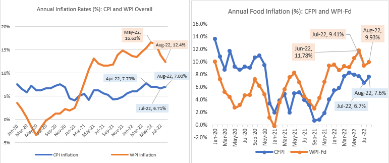 The annual WPI and CPI inflation rates in August were 12.4% (down from 13.9% in July) and 7% (up from 6.7% in July), respectively. In terms of food, the wholesale inflation rate was 9.93% (up from 9.4% in July) and at the retail level (consumer food price index), the inflation rate was 7.6% (up from 6.7% in July).