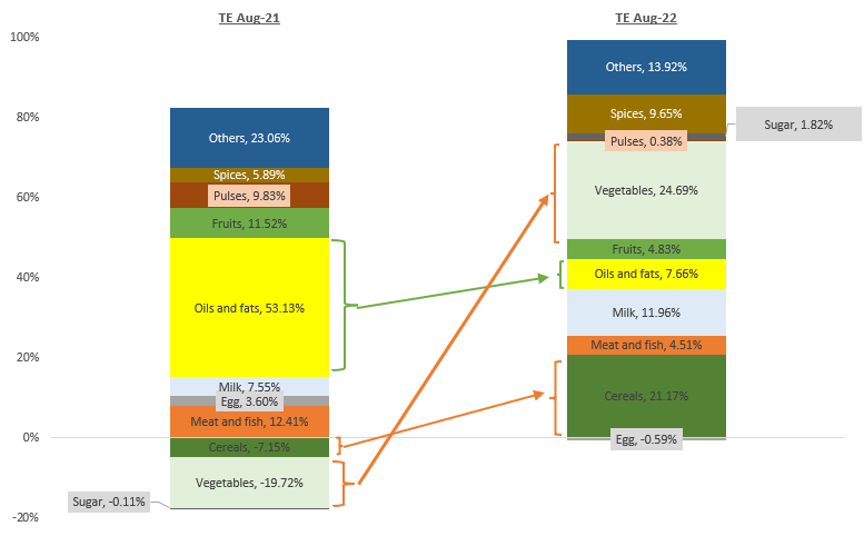 Compared to this, in August 2021, major drivers of food inflation were edible oils (whose annual inflation rates averaged about 33%), meat (average inflation rate of 18%) and fish, milk and pulses (average inflation rate of 8-9%).