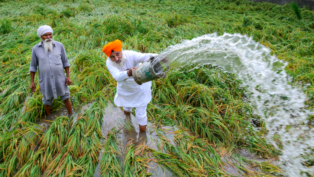 Farmers clear flood water from their paddy field at a village on the outskirts of Amritsar, September 10, 2021. Photo: PTI