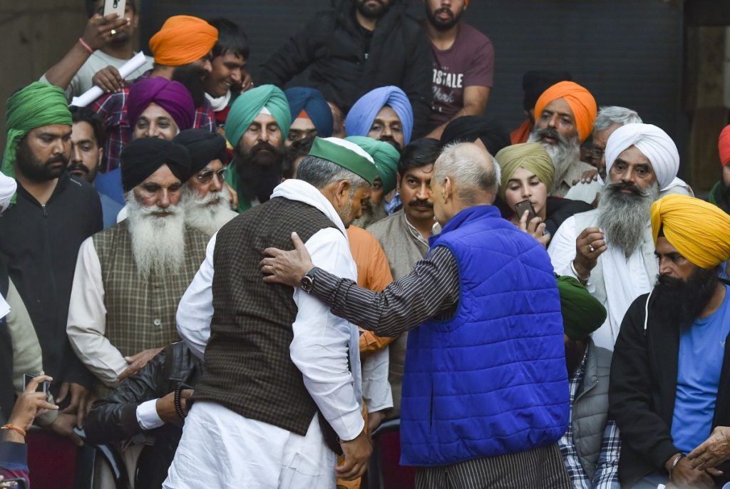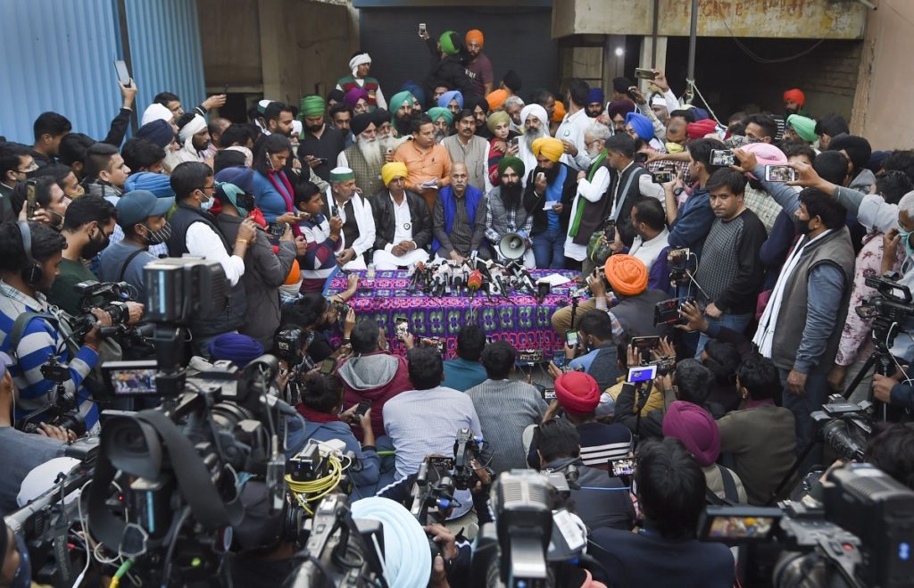 farmer leaders address media after a meeting regarding the Centres farm reform laws, near Singhu border in New Delhi, Wednesday, Dec. 9, 2020. Photo: PTI