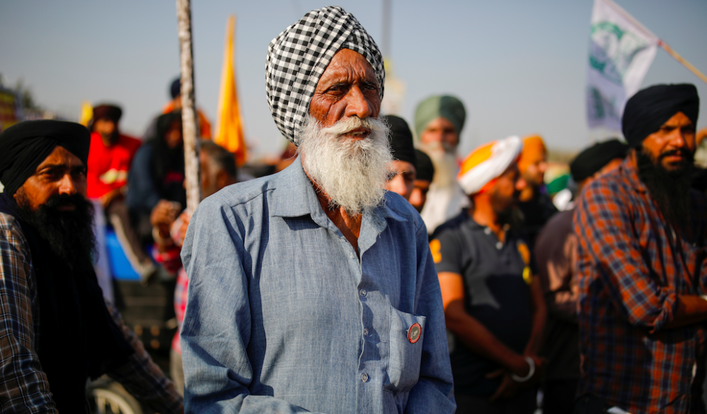 Farmers listen to a speaker during a protest against the newly passed farm bills at Singhu border near New Delhi, India, December 9, 2020. Photo: Reuters/Adnan Abidi