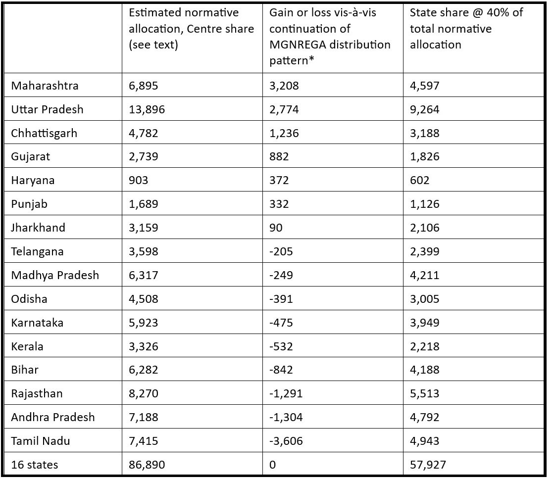 The results are presented in the table below. The first column presents our estimates of the normative allocations implicit in the SBI report (Union’s share only). The second column presents the difference between these allocations and what state allocations would be if the same grand total (Rs 86,890 crore for these 16 states) were distributed across states in the same way as MG-NREGA funds – taking average MGNREGA allocations in the last three complete financial years as the base.