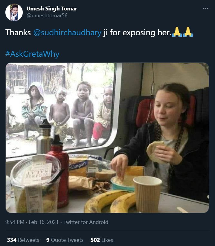 Meanwhile, a picture of Thunberg inside a train compartment is widespread on social networking platforms. The picture shows the 18-year-old consuming food inside a train as children allegedly watch her through the window. Twitter user @bembadep posted this picture and wrote, “India ask these anti forces #AskGretaWhy”. The tweet amassed over 700 retweets as of this writing. (Archive link)