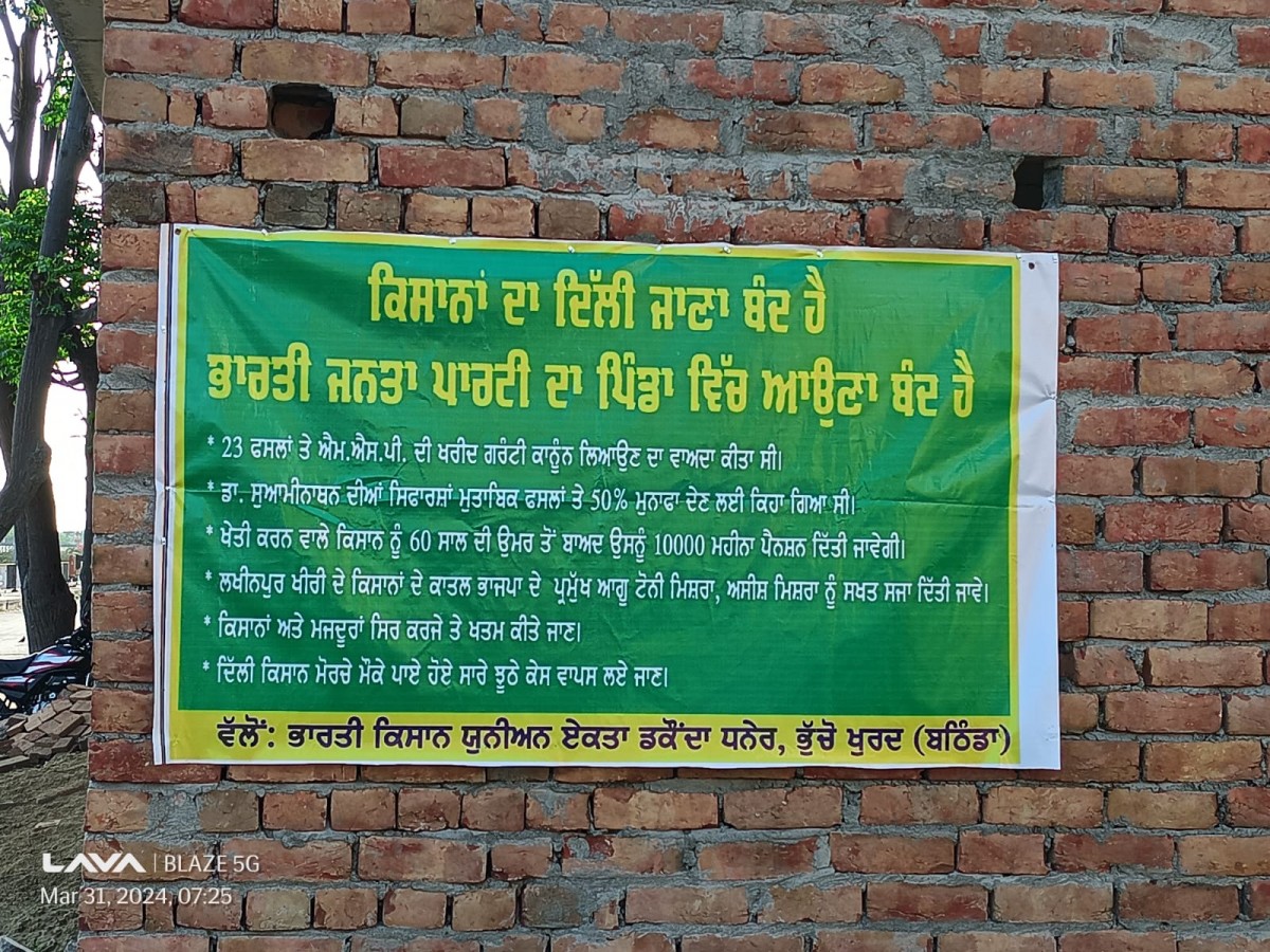 In most villages, farmers have been putting up posters with slogans like ‘Kisana da Delhi jana band hai, BJP da Pinda vich auna band hai (Farmers are barred from entering Delhi, BJP is banned from entering villages)' issued by the BKU (Ekta Dakaunda), Bhucho Khurd, Bathinda district.