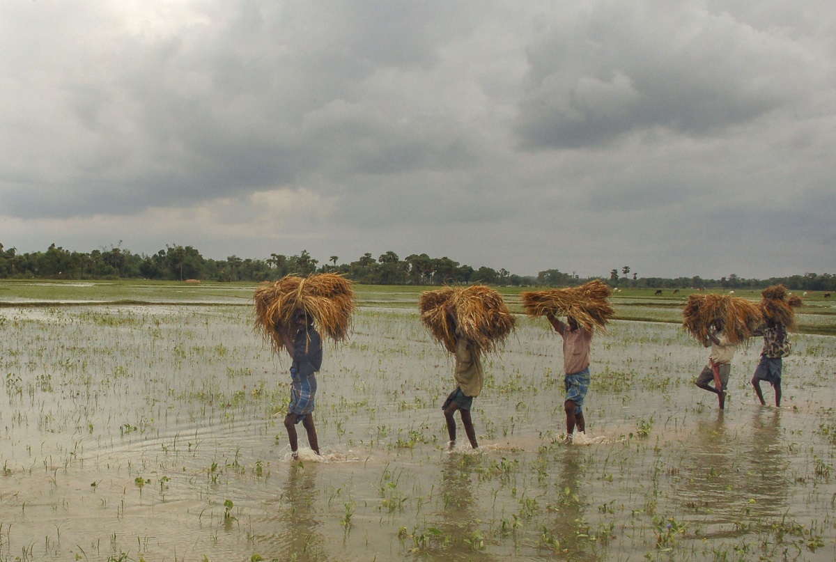 Farmers carry wheat as they return to their homes following heavy rainfall induced by Cyclone Amphan, in Birbhum district of West Bengal, May 21, 2020. Photo: PTI
