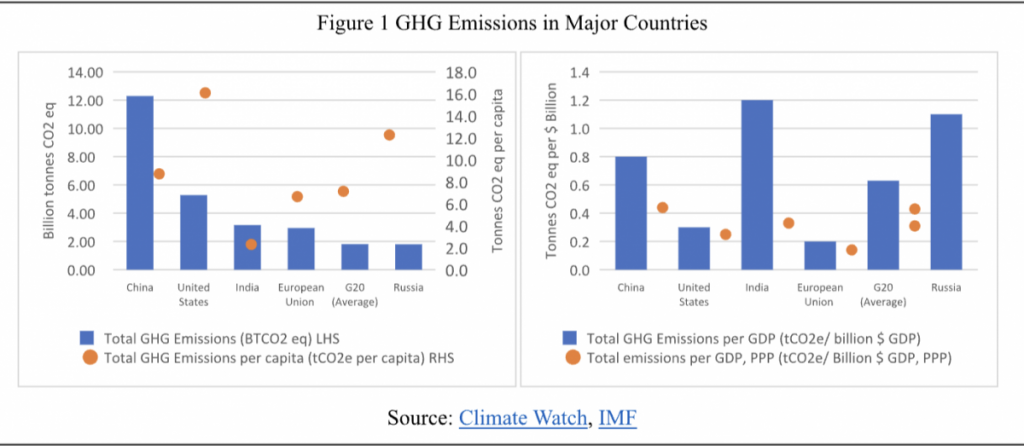 India ranks as the world’s third-largest GHG emitter, with a total of 3.16 billion tonnes of carbon dioxide equivalent (CO2 eq) emissions. However, when considering emissions per capita, India emits 2.29 tonnes per person, which is comparatively lower than other major countries. For instance, the European Union (EU) has slightly higher GHG emissions overall, but only one-third of the emissions per capita. In contrast, the United States and China have 7- and 4-times higher GHG emissions per capita, respectively. It’s important to note that India’s modern economic development began later, contributing to its higher emission intensity, both with respect to GDP and GDP, relative to advanced economies in 2021.