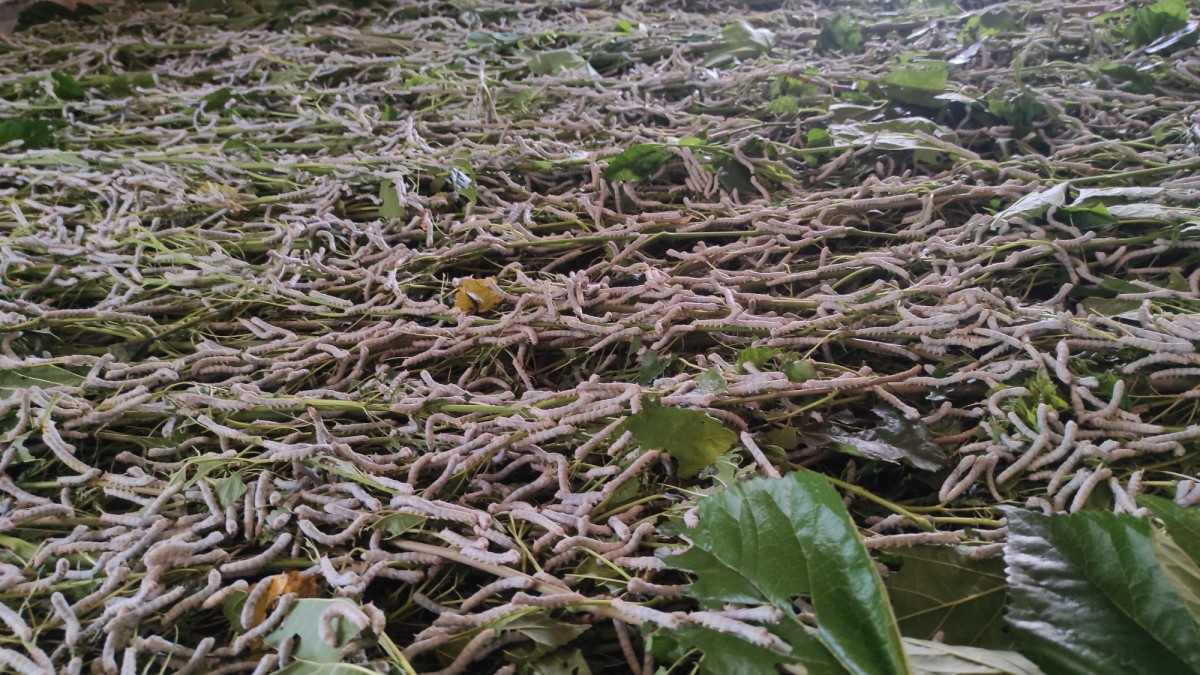 A bed of silkworms with mulberry leaves thrown inside the one-room family home in Mallanaya.
