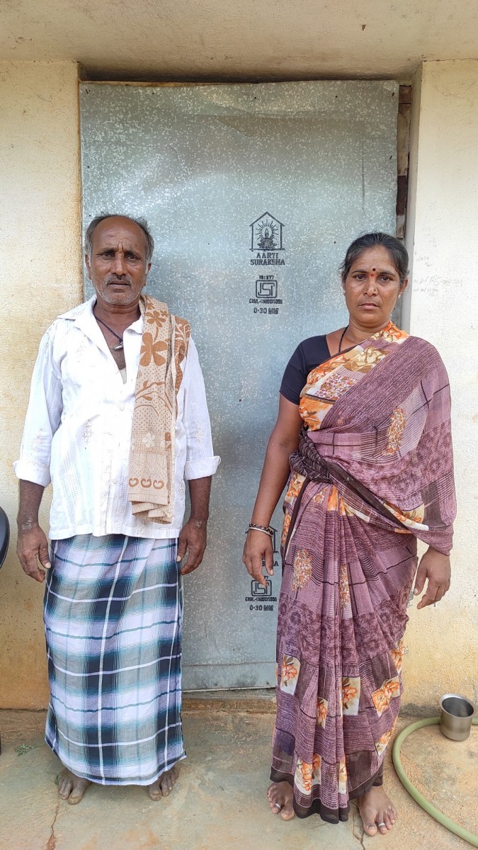 Mamatha C. (right) and Manchayah M.S., Sandesh's parents, in front of their house in Mallanayakanahalli, Mandya district.