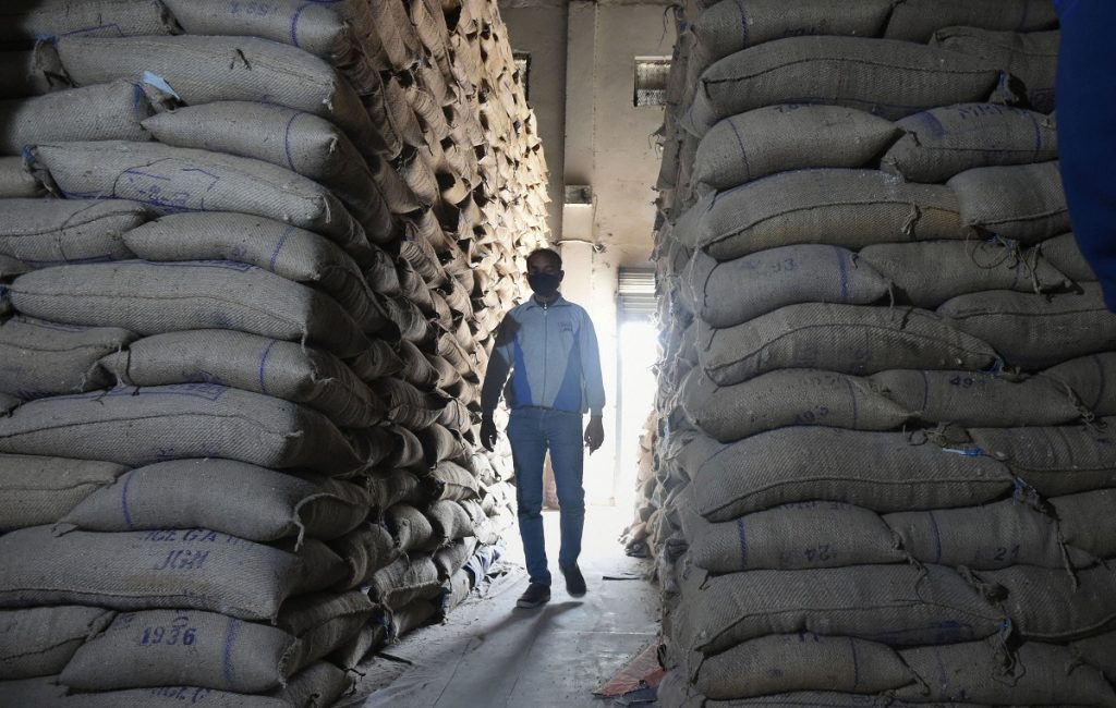 An employee inspects a godown of Food Corporation of India (FCI) where rice bags are being stored in Srinagar, April 14, 2020. Photo: PTI /S. Irfan