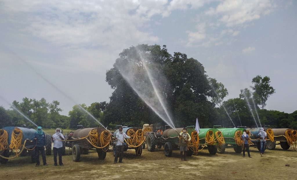 Farmers use tractor-mounted tankers to spray water as part of a mock drill to prepare themselves for locust attackJune 2, 2020. Photo: PTI