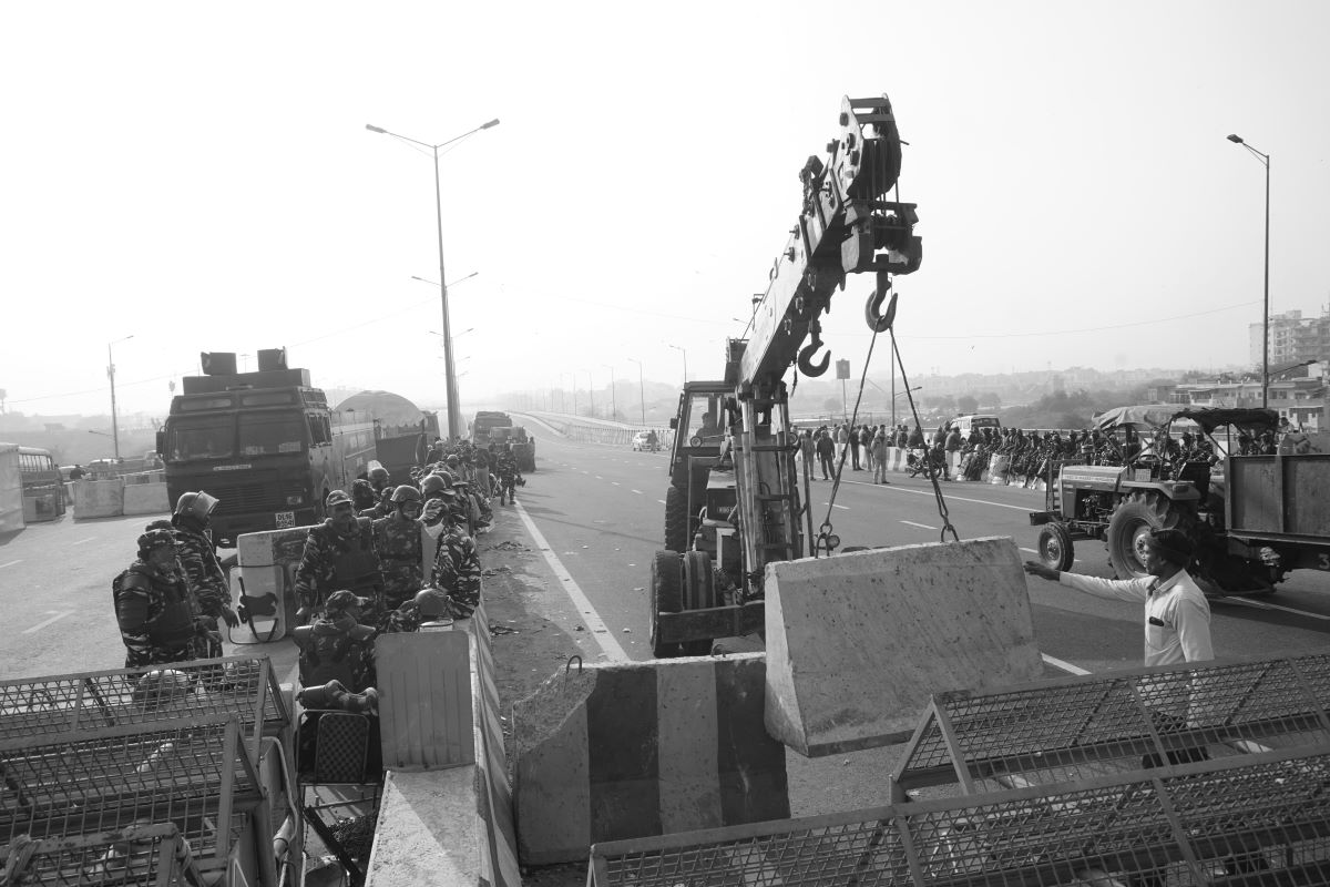 Concrete checkpoints and barricades put on NH24, at the Delhi-UP border, in Ghazipur. Photo: Shome Basu