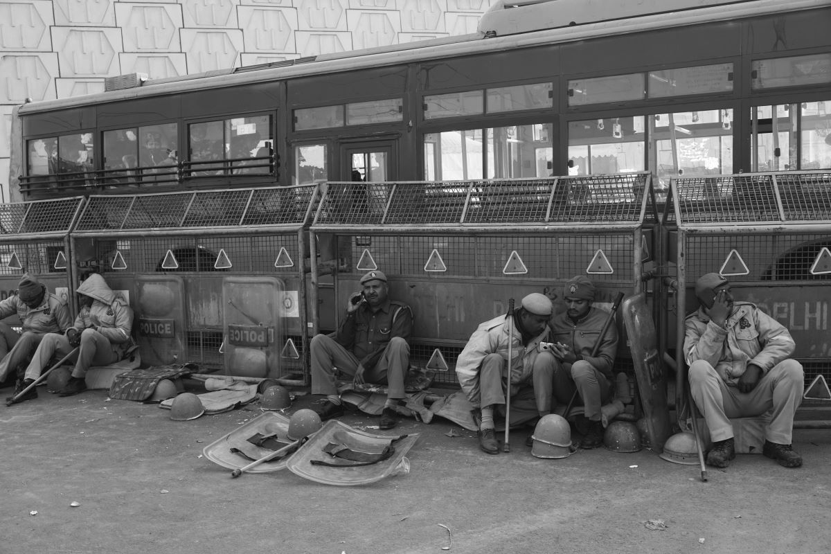 UP Police taking a break at the protest site on the Delhi-UP border, Ghazipur. Photo: Shome Basu