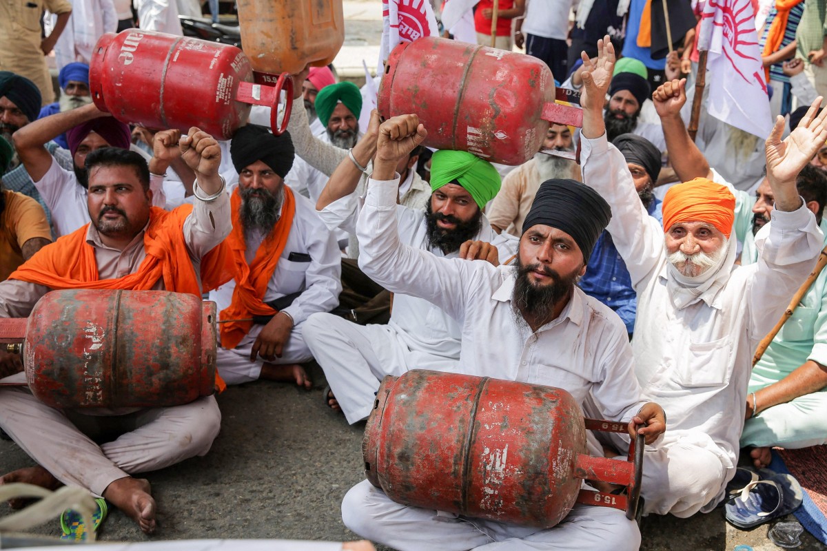 Farmers shout slogans against Prime Minister Narendra Modi during a protest against the hike in petrol, diesel and cooking gas prices, at the Golden Gate on the outskirts of Amritsar, Thursday, July 8, 2021. Photo: PTI