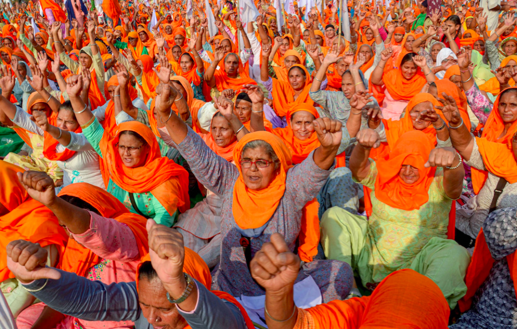 Women from the farming community raise slogans as they take part in the ongoing farmers agitation, against the central governments newly introduced agri-bills, in Amritsar, October 23, 2020. Photo: PTI
