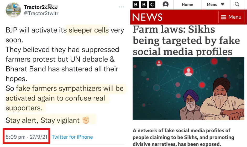 In this backdrop, a report has been released by a UK-based organisation – Centre For Information Resilience (CIR) – which has revealed that fake social media accounts were being run on Twitter, Facebook and Instagram to run a divisive propaganda against Sikhs and discredit the struggle of a majority of farmers in the ongoing stir.