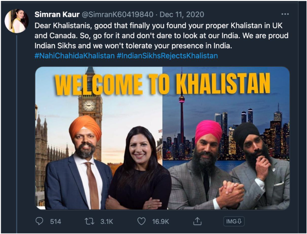 In one post, the two Sikh members of the UK parliament – Preet Kaur Gill and Tamnanjeet Singh Dhesi – and one Jagmeet Singh who is member of the house of commons of Canada, were labelled Khalistani.