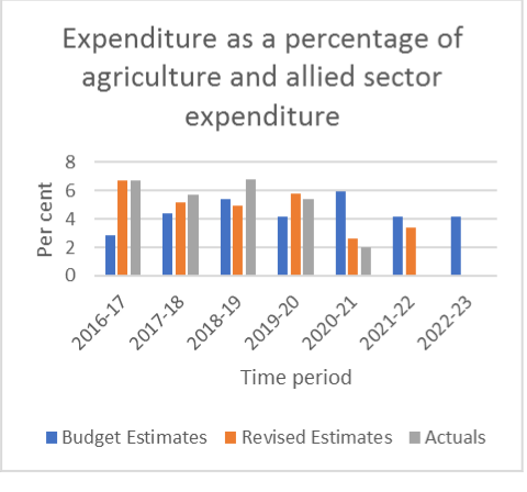 Despite a decline in the insured area as a per cent of the total sown area and a low proportion of insured farmers of total agriculture households in PMFBY, the government budget estimates and actual expenditure on PMFBY have continuously increased in both absolute and relative to overall expenditure on the agriculture and allied sectors between 2016-17 to 2019-20.