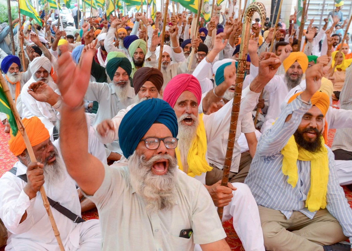 Farmers protest outside Food Corporation of India (FCI) office in Amritsar, Monday, April 5, 2021 Photo: PTI