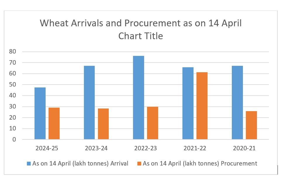 As of April 14, the arrivals in Punjab were only 38,276 tonnes. In a normal year, by Baishaki, Punjab mandis would see arrivals exceeding 5 lt. Since harvesting is delayed, it is hoped that Punjab will see much higher arrivals in the next fortnight and its total contribution to central pool stocks will again exceed 100 lt.