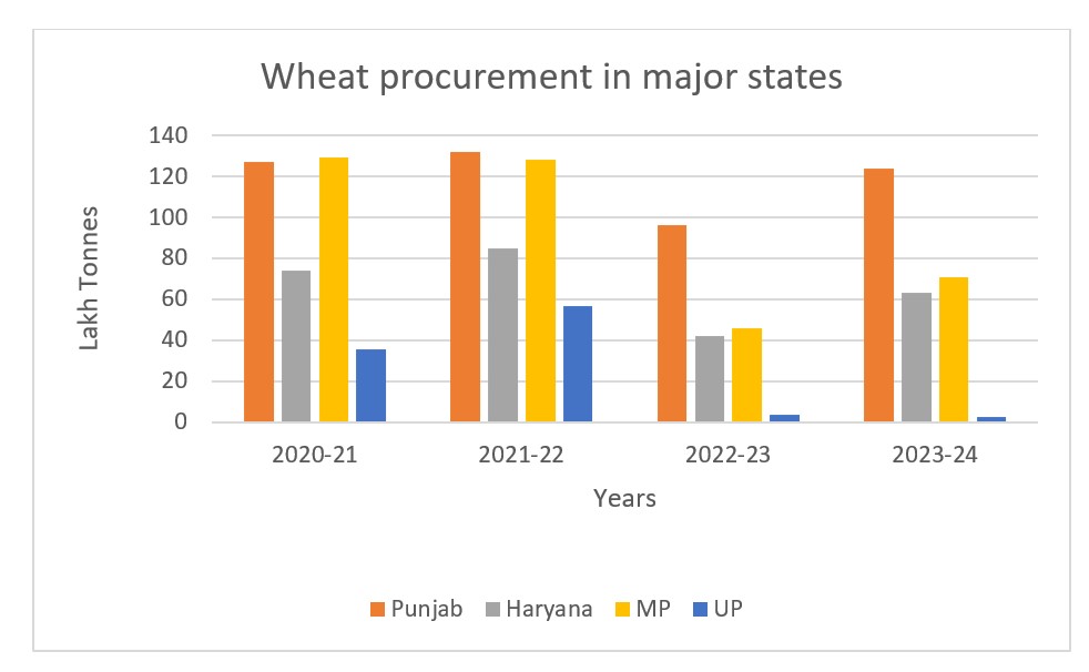 Uttar Pradesh has been an unreliable contributor to wheat procurement, as it contributed only 3.36 lt in 2022-23 and 2.2 lt in 2023-24. One reason for this is that the private trade avoids purchases in Punjab and Haryana due to high market fees, rural development cess and arhatiya commission.