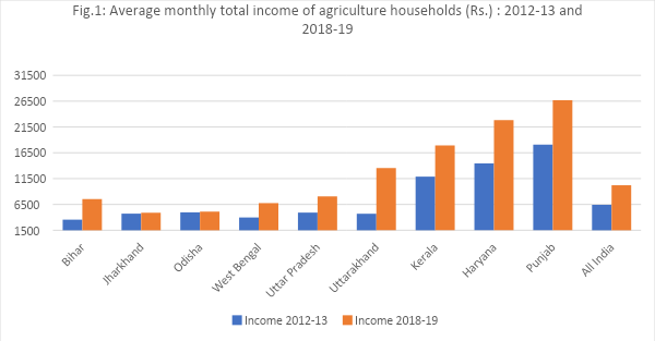 In terms of annual rate of growth in nominal income, Bihar and Uttarakhand farmers have achieved a much higher growth at 13.34% and 19.3% in comparison to farmers in Jharkhand at 0.61%; Odisha at 0.45%, Punjab at 6.73% and other states averaged 8%.