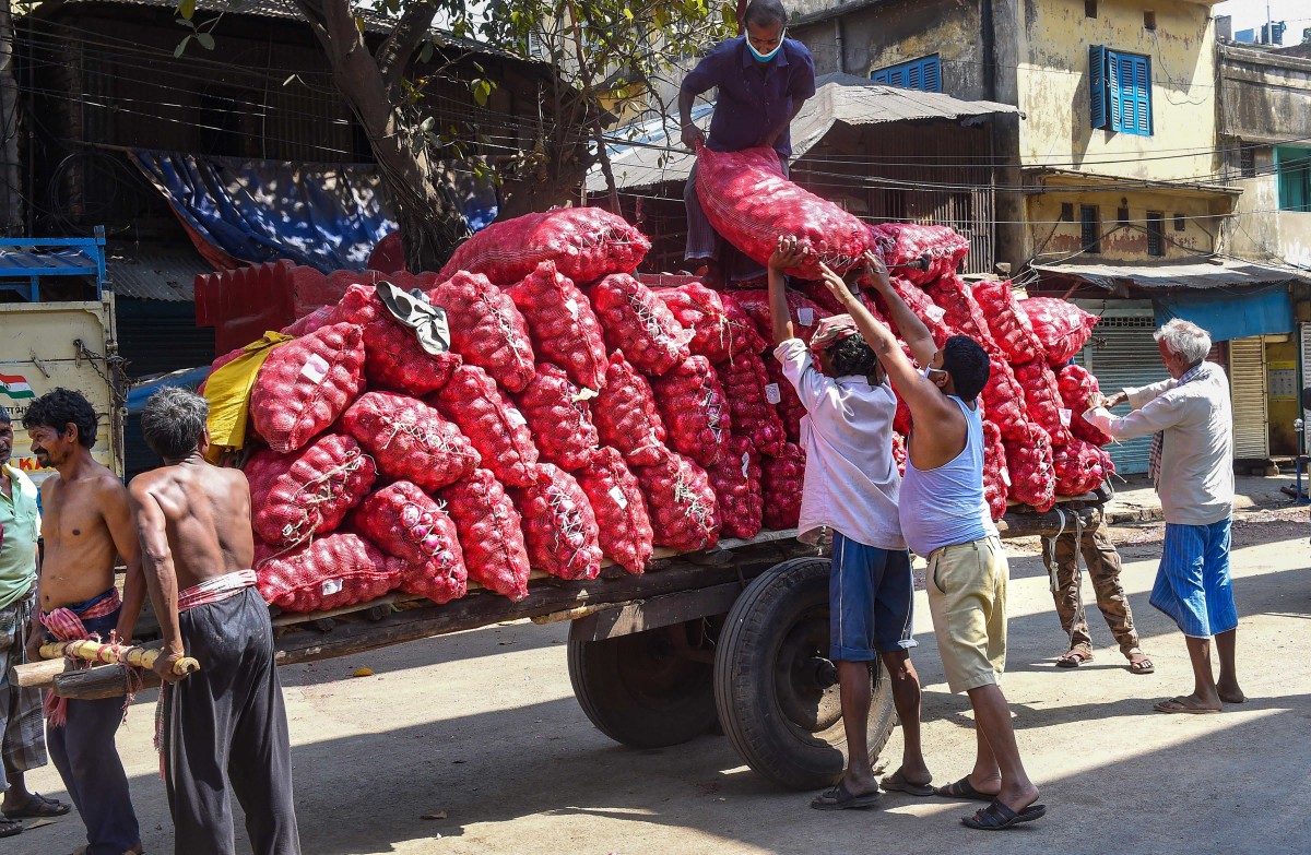 Labourers load sacks of vegetables on a hand pull cart during the nationwide lockdown imposed in the wake of coronavirus pandemic, in Kolkata, Thursday, March 26, 2020. Photo: PTI/Ashok Bhaumik