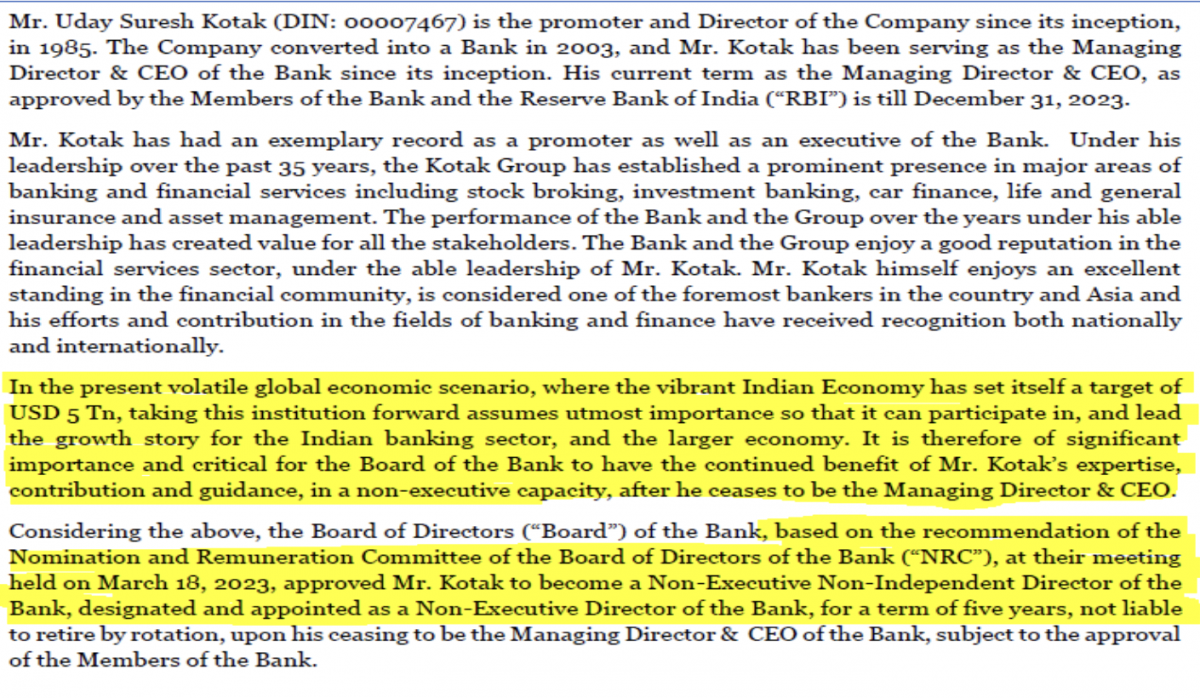 The move to appoint Uday Kotak as a non-executive, non-independent director for 5 years commencing from January 1, 2024 should also be seen in the light of the announcement made on May 26, 2022 of appointing with much fanfare, the then 32-year old Jay Kotak, Uday Kotak’s son as a business head in the bank. The fast tracking of his relatively inexperienced son to an important post by the board of directors on “merit” is an indication of the future succession planning.