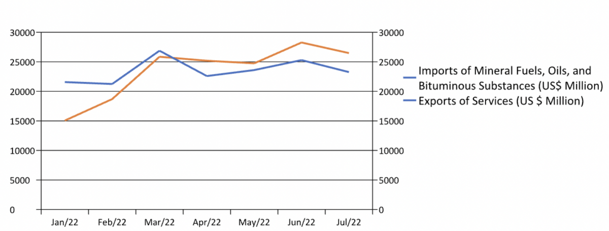 According to an estimate from the Union Ministry of Commerce, the trade deficit for the first quarter (April-July 2022) is US $96.5 billion. The trade surplus on account of services during the same period is US $35.8 billion. The data on account of net income from abroad is not available as yet.
