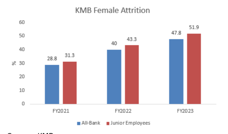 Commenting on gender equality at KMB, the board of directors has publicly emphasised the bank's commitment as an equal opportunity employer with significant female participation in the workforce. However, there remains an important issue that the directors have not addressed adequately: the bank's higher female attrition rate compared to overall attrition, which is showing an alarming upward trend.