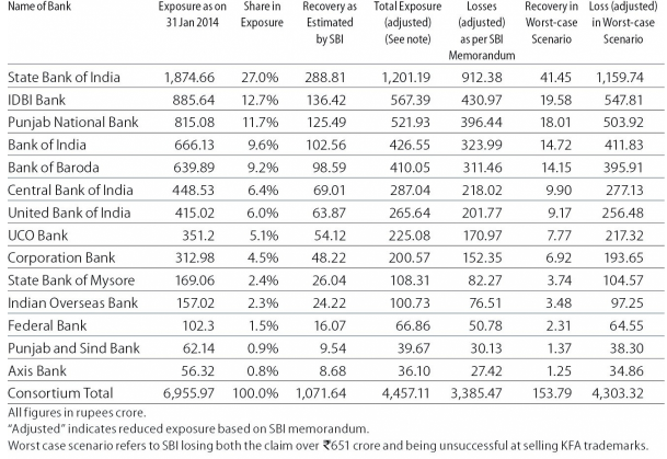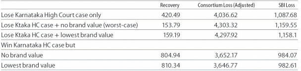 This is the reason we argue that SBI has overstated its recoveries. Excluding the amount pending before the Karnataka high court, the consortium's recoveries fall to Rs 420 crore and their losses work out to Rs 4,037 crore, with SBI losing Rs 1,160 crore out of its exposure of Rs 1,201 crore. Additionally, assuming that KFA's trademarks are worthless gives us the worst-case scenario, under which the bank consortium's losses are Rs 4,303 crore as their recoveries fall to Rs 153 crore, which is the value of both the real estate properties (see Table 2).