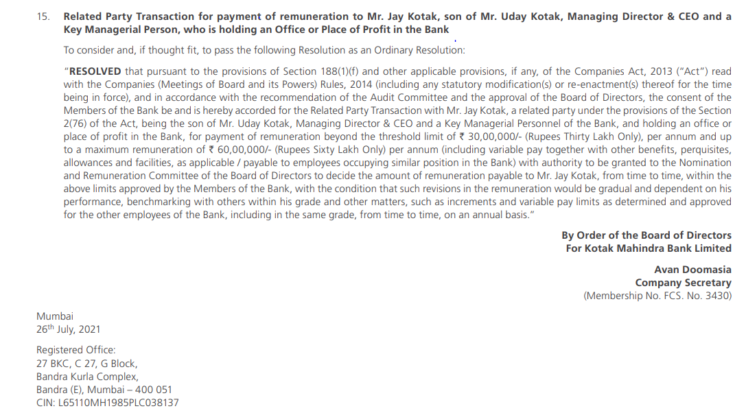 The bank took the required approval from KMB shareholders for granting Jay Kotak’s compensation, as he was a related party to the CEO. However, the explanation to shareholders in the notice dated July 26, 2021, did not mention that he had been appointed as a co-business head.