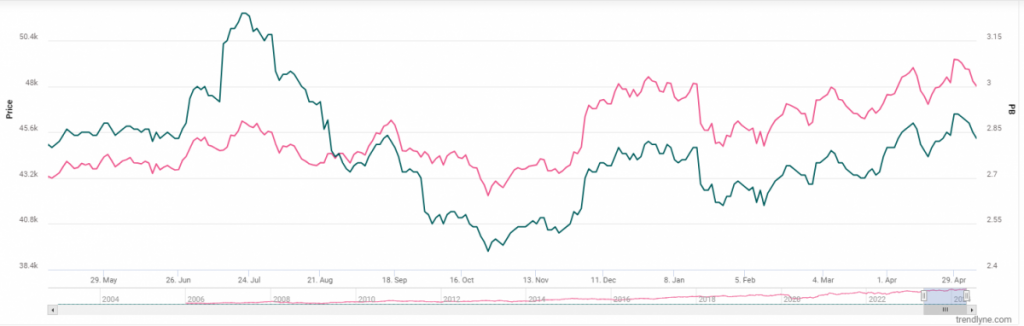 Kotak Mahindra Bank price-to-book-value (P/BV) and share price history for last five years