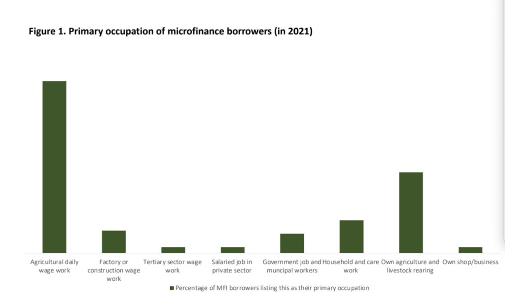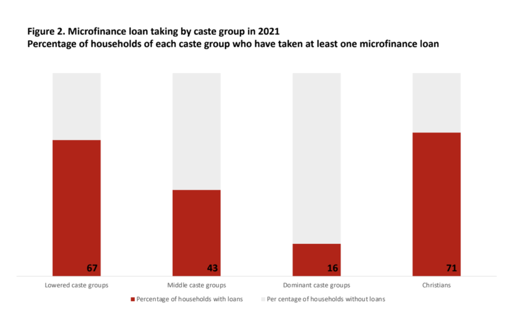 Our quantitative surveys with 406 households in 2021-2022 show that close to 70% of lowered caste households and 40% of women from intermediate caste households had taken microfinance loans, compared with only 16% of dominant caste households (Figure 2).
