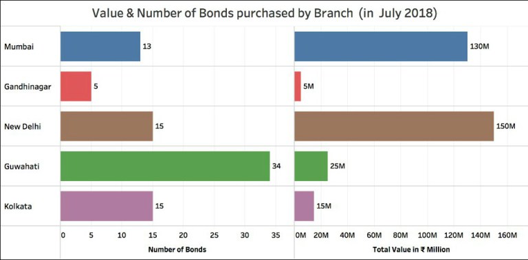 A total of 82 bonds worth Rs 32.5 crore were purchased in the July cycle, taking the total value of bonds purchased in the four cycles to Rs 470.8 crore. In terms of number of bonds purchased during the July cycle, Guwahati was on top with 34 bonds followed by 15 each in Delhi and Kolkata. Bonds were purchased for the first time in Guwahati branch. Out of the total 34 bonds purchased in Guwahati branch, ten were of Rs one lakh denomination while the remaining 24 were of Rs 10 lakh denomination. In terms of the value, bonds worth Rs 15 crore were purchased in New Delhi, all in denomination of Rs one crore. Mumbai followed with bonds worth Rs 13 crore, all in denomination of Rs one crore. Delhi and Mumbai accounted for more than 80% of the bonds purchased in terms of value.