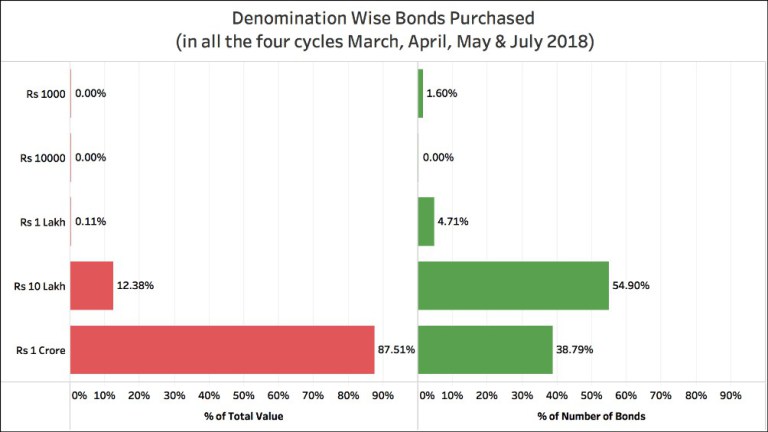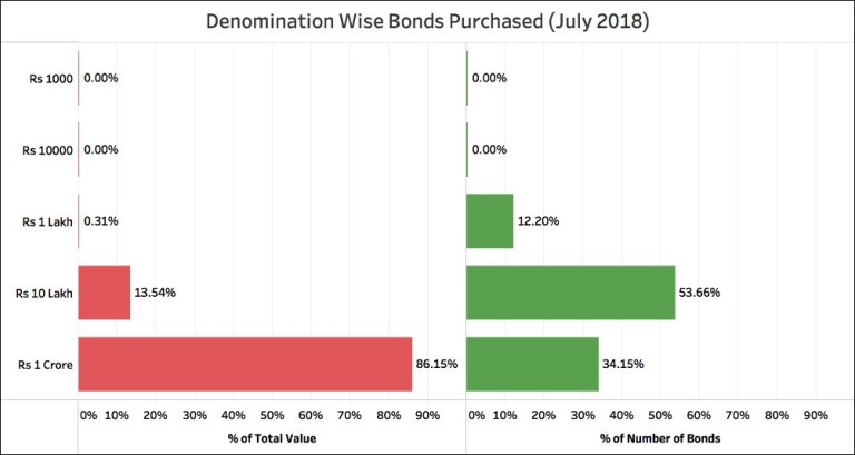 Data for July 2018 indicate that the bonds of lower denomination were hardly in demand like in the other cycles, an indication that citizens may not be purchasing these bonds. Not a single bond was purchased in the denomination of Rs 1000 and Rs 10,000. Out of the 82 bonds purchased, 10 were of Rs 1 lakh denomination, 44 were of Rs 10 lakh denomination and the remaining 28 were of Rs 1 crore denomination. Together, bonds in the denomination of Rs 10 lakh & Rs 1 crore accounted for 99.7% of the bonds purchased in terms of value. It is highly likely that the Rs ten lakh and Rs one crore denomination are purchased by corporates than individuals. There is no concrete information on the type of purchasers since SBI has refused to share such information.