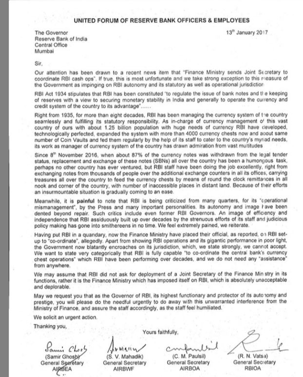 “Our attention has been drawn to a recent news item that Finance Ministry sends Joint Secretary to coordinate RBI cash ops,” the letter starts. “If true, this is most unfortunate and we take strong exception to this measure of the Government as impinging on RBI autonomy and its statutory as well its operational jurisdiction”.