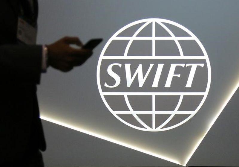 A man using a mobile phone passes the logo of global secure financial messaging services cooperative SWIFT at the SIBOS banking and financial conference in Toronto, Ontario, Canada October 19, 2017. Picture taken October 19, 2017. Credit: Reuters/Chris Helgren/File Photo