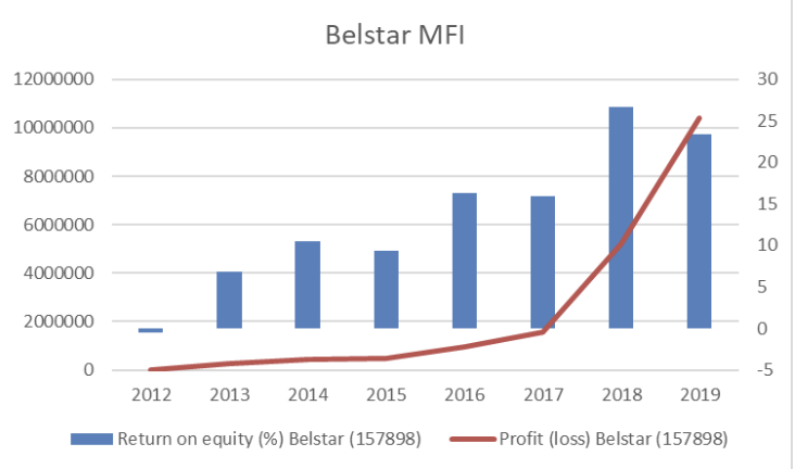 Belstar net profits (after taxes) and return on equity in %. MIX Market dataset, World Bank.